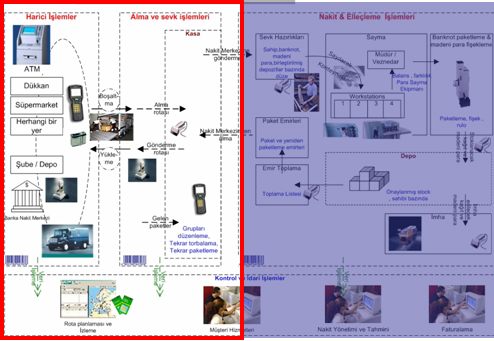 Sistemin esası, depodan müşteriye ve nakit merkezlerine kadar, barkodlu parçaların kayıtları ve hareketleridir. Bu işlemler içinde kasa(lar), rotalar, işyerleri bu hareketlerin temelini teşkil eden anahtar varlıklardır. Bir parça başka bir parçanın ( konteynır ) içine yeniden paketlenebilir ve bu paket te içeriğini kaybetmeden barkodlu düzenli bir parça haline dönüşür. Bir rota planlanabilir ve değiştirilebilir ve müşteri işyerlerine, diğer depolara , (banka) nakit merkezlerine ve ATMlere uğranabilir. Ayrıca bir depodan diğerine büyük çaplı bir nakil gerçekleştirmek için bir ana hat rotası de belirlenebilir. Bir el tarayıcısı kullanmak entegre işlem çözümümüzün bir parçasıdır. Yazılım tarayıcı markasından bağımsızdır.